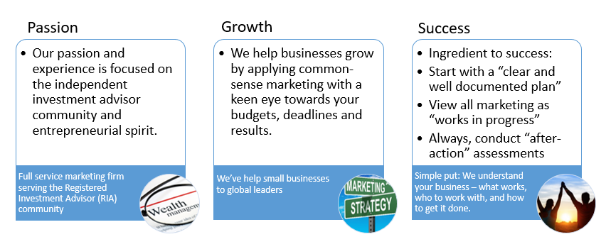 Budget, expertise, time, staffing should not prevent you from focusing on marketing your firm. Many smaller firms struggle with the costs or need to hire a full-time staff member. In addition, to find the right person with specific RIA industry experience can be difficult.